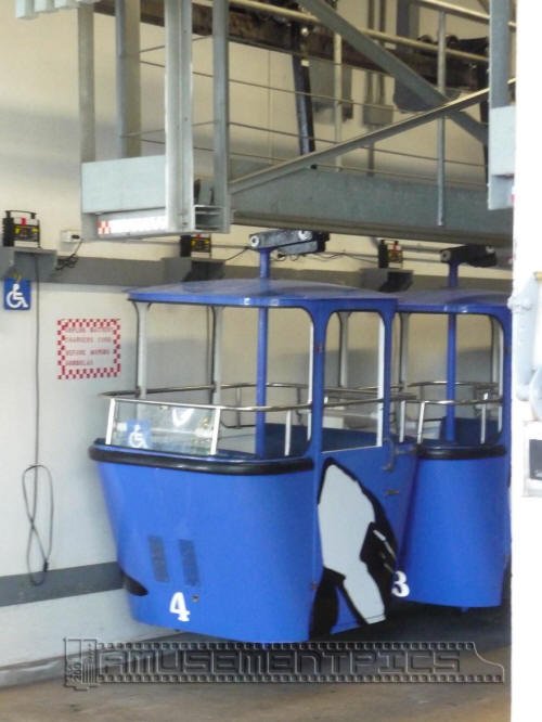 The blue gondolas feature the likeness of a killer whale, long the